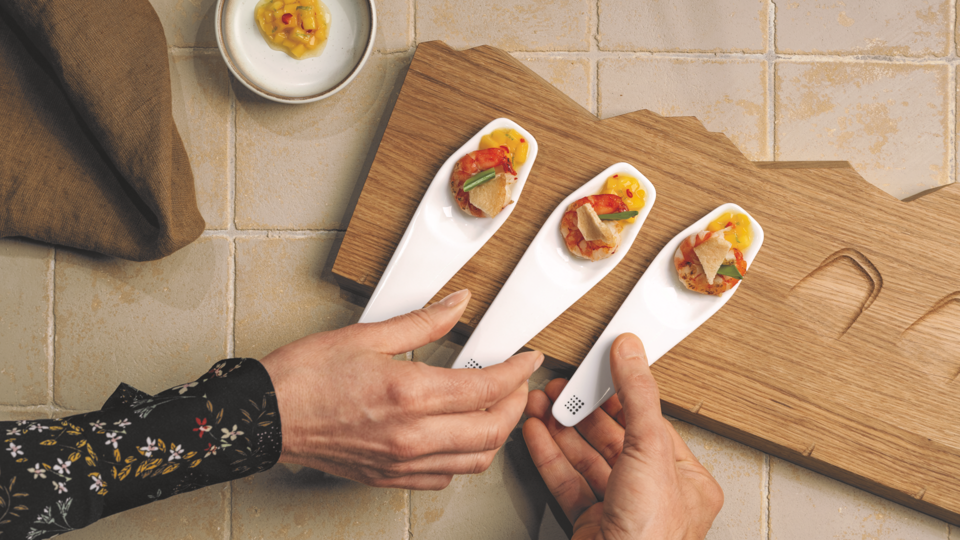 Das hochwertige Servierbrett Wendelstein 1838 m aus Holz bringt die Sterneküche in Ihr Zuhause. Starten Sie Ihr Menü mit einem köstlichen Amuse-Gueule, meisterhaft angerichtet auf den edlen Löffeln aus Porzellan. Die BORA Servierlöffel Piccolo passen perfekt in die dafür vorgesehenen Einkerbungen im Servierbrett, sodass Sie ihr Fingerfood optisch besonders ansprechend servieren können. Das Design des BORA Bretts ist eine Hommage an den 1.838 m hohen Berg in Bayern und zeigt dessen Konturen.