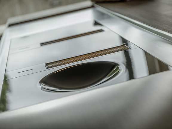• Un sistema di estrazione integrato nel piano cottura crea spazio per ganci sul soffitto per tenere pentole e padelle a portata di mano.
