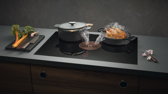 The fully flush-mounted induction cooktop offers four cooking zones.With its ergonomic design and arrangement of functions, the innovative operating concept is sure to win you over. The most important functions with their acoustic and visual feedback can be quickly operated via the intuitive vertical slider (sControl) at the push of a button.