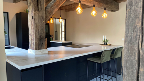• Barhocker am zentral platzierten Küchenblock schaffen weitere Sitzplätze und unterstreichen die gesellige Atmosphäre.