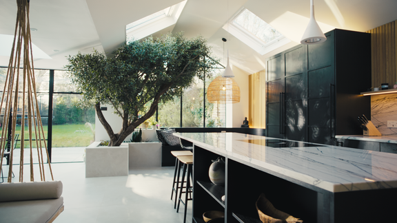 Tipp: Holen Sie sich die Natur in Ihre Japandi-Küche – beispielsweise mit einem großen Olivenbaum als Eyecatcher oder Bambuspflanzen für die asiatische Note.