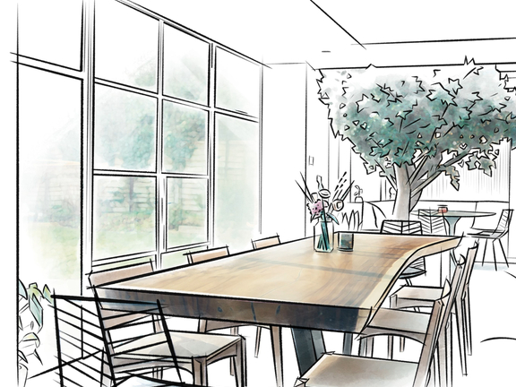 • In Japandi-Küchen lädt etwa ein großer Tisch mit naturbelassener Massivholzplatte und markanter Baumkante im Zentrum des Raums zu geselligen Stunden ein.