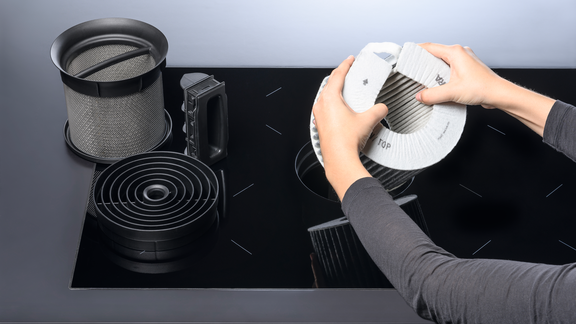 Nur wenn der Kochfeldabzug im Umluftbetrieb arbeitet, wird zum Edelstahl-Fettfilter zusätzlich ein Geruchsfilter (Aktivkohelfilter) eingesetzt.