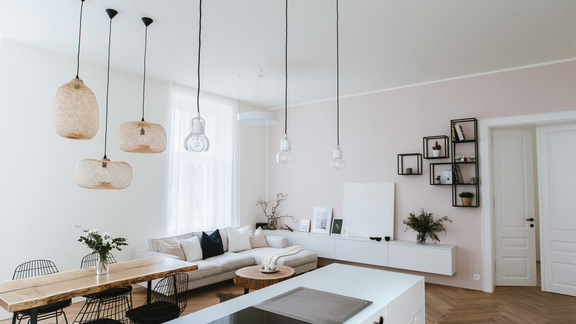 Wohnküchen bieten vielfältige Gestaltungsmöglichkeiten. Bei Renovierungen eignet sich zum Beispiel ein Stilmix mit reizvollen Kontrasten an: Kombinieren Sie einen alten Parkettboden und gemütliche Mid-Century-Sitzmöbel aus Holz mit hochglänzenden weißen Küchenmöbeln und innovativen Produkten wie dem modularen BORA Classic Kochfeldabzugssystem. Denken Sie auch an ungewöhnliche dekorative Elemente, die das wohnliche Feeling verstärken: Hängen Sie einen Kristallleuchter über den Esstisch oder stellen Sie einen Mid-Century-Vitrinenschrank mit Büchern aus dem Antiquariat an eine Wand.