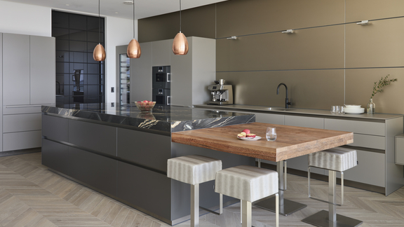 Wollen Sie trotz begrenztem Platz nicht auf eine Kücheninsel verzichten? Ersetzen Sie dann den separaten Esstisch, der viel Platz in der Küche wegnimmt. Wählen Sie stattdessen eine Kücheninsel, die den Koch- und Arbeitsbereich mit einem erhöhten Bartresen kombiniert, an dem drei oder sogar vier Personen nebeneinander sitzen können. Sie möchten dem Partner lieber gegenüber sitzen? Ein hoher Bartisch mit zwei Barstühlen passt platzsparend auch in kleinere Räume.