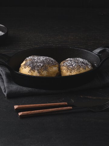 Die restlichen Zutaten in eine Rührschüssel geben. Warme Milch hinzugeben und zu einem glatten Teig verkneten.