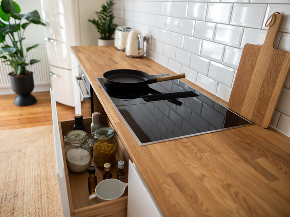 Geht es darum, eine Mini-Küche zu planen, zählt jeder Zentimeter. Nischen lassen sich mit extra schmalen Schränken oder Ausziehregalen effizient ausnutzen, Eckschränke schaffen zusätzlichen Stauraum. Kaufen Sie Vorratsbehälter, Kochgeschirr und Co. durchdacht: Stapelbare Systeme sowie Töpfe und Pfannen mit abnehmbaren Griffen nehmen in Schränken nur wenig Raum ein.