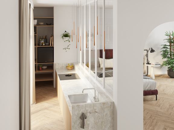 Mini-Küche planen und dabei hoch hinausgehen: Die Raumhöhe lässt sich nicht nur mit deckenhohen Schränken miteinbeziehen.