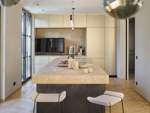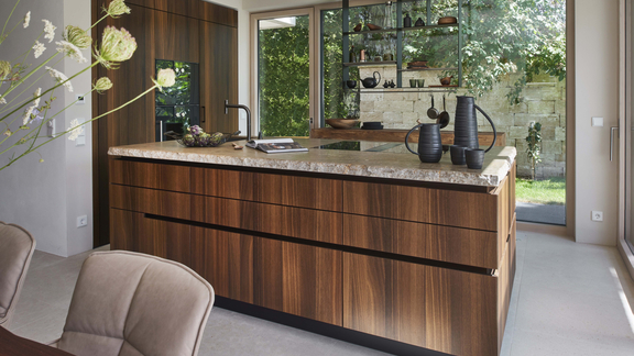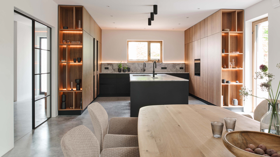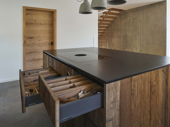 Offene Räume verlangen eine ruhige, aufgeräumte Gestaltung. Geschlossene Fronten schaffen Klarheit, offene Regale setzen gezielte wohnliche Akzente. Eine Kücheninsel mit Auszügen auf beiden Seiten teilt Koch- und Essbereich, bietet Stauraum und sorgt für Struktur. Ein integriertes BORA Kochfeldabzugssystem hält Sichtachsen frei und macht die Küche zum Teil des Wohnraums.