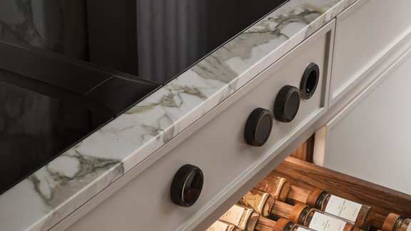 Ordnen Sie etwa die fünf Küchenzonen Bevorratung, Aufbewahrung, Spülen, Vorbereitung und Kochen logisch an. Ersetzen Sie feste Einlegeböden in den Schränken durch komfortable Auszüge, um den Stauraum bis in die Tiefe vollständig nutzbar zu machen. Nutzen Sie die Raumhöhe mit deckenhohen Schränken und schließen Sie verbleibende Nischen mit passgenauen Vollauszugschubladen. Idealerweise liegt die Vorbereitungszone zwischen Spüle und Kochfeld - so arbeiten Sie flüssig und vermeiden unnötige Wege.