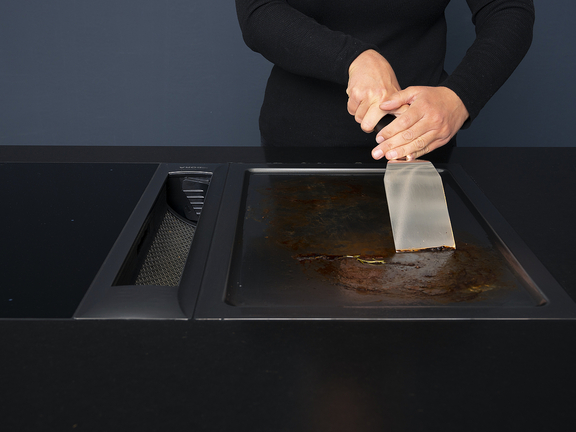 Ruckzuck sauber: Um den Teppanyaki sauberzumachen, benötigen Sie nur wenige Minuten – und die BORA Tepan Reinigungsfunktion assistiert Ihnen dabei. Zwei Schritte führen zur blitzblanken Grillplatte:
