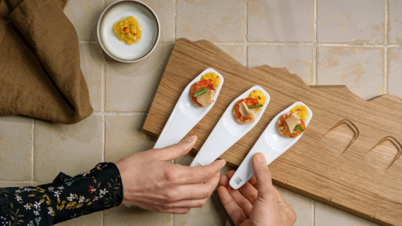 Je einen TL Mangosalsa auf die Piccolo-Löffel verteilen und mit Garnele, Zuckerschote und Krabbenchips garnieren.