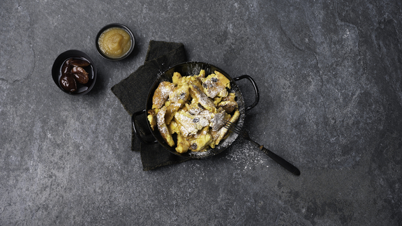 Den Kaiserschmarrn nochmals auf dem Tepan-Edelstahlgrill ausbreiten und 1 Min. karamellisieren.