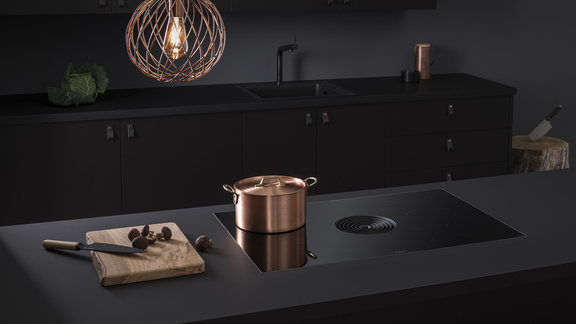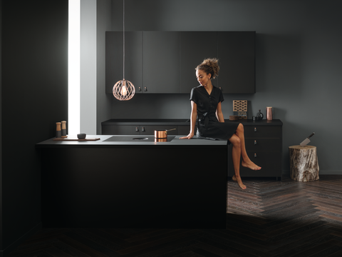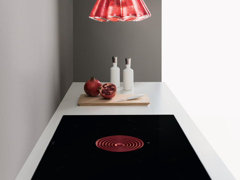 In a minimalist design, the system has an induction cooktop with four cooking zones on which there is room for up to four pots measuring up to 24 cm each. In the middle of the fully flush-mounted system we can find the round air inlet nozzle with eight rings radiating out from the centre. The central touch control with the red, illuminated, vertical, easy-to-use slider is another design element. The user interface is practically invisible when the cooktop is on standby mode, creating an elegant “Black Vision” effect.