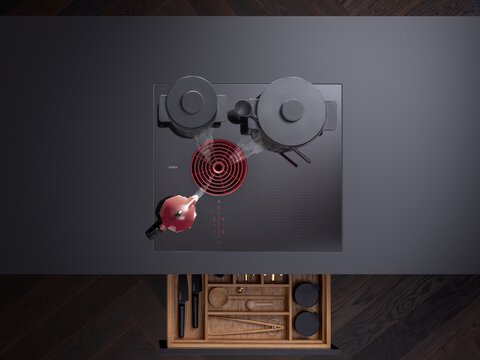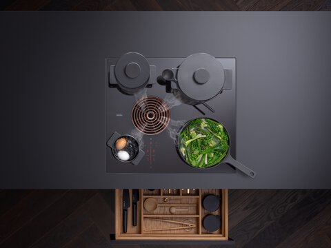 With a width of just 60 cm, this ultra-compact cooktop boasts an impressive range of options. It fits into even the tiniest of kitchens, solving all of your space dilemmas. The BORA S Pure can also be installed in standard kitchen units, so it can be integrated into any kitchen design. At 199 mm, the low installation height and integrated recirculation unit preserve maximum storage space for pots in the cupboard below the cooktop. The system has four different cooking zones which are suitable for all standard pot sizes. The entire cooktop surface can be used optimally thanks to the specially developed induction coils and the asymmetric arrangement of the extractor opening.