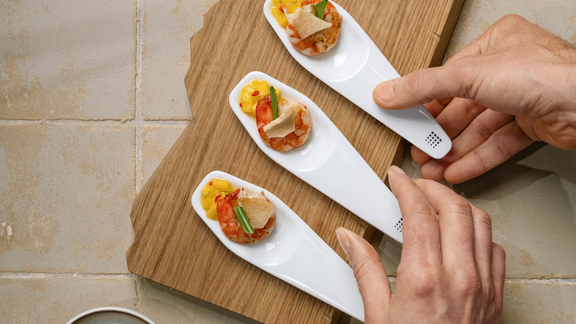 To serve, place a teaspoon of mango salsa on each Piccolo spoon and garnish with prawns, mangetout and prawn crackers.