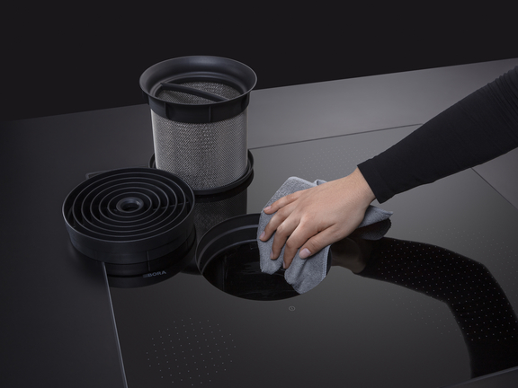 The grease filter fitted in all BORA cooktop extractors can be cleaned. Recirculation cooktop extractors also have an activated charcoal filter which cannot be cleaned and must be replaced regularly.