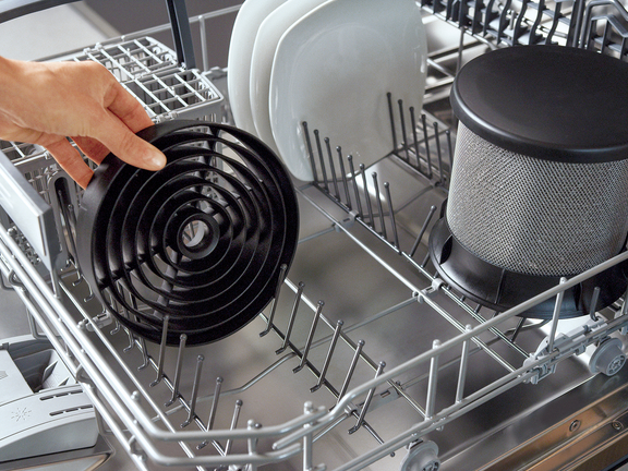 No. Our activated charcoal filters cannot be cleaned – neither in the dishwasher nor by hand. If the activated charcoal is no longer absorbing unpleasant odours, the filter must be changed.