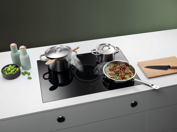 When cooking on an induction hob, the risk of burns is relatively low as the heat generated is concentrated at the base of the cookware. The surrounding area of the cooktop is heated significantly less, merely from the heat recovered from the cookware. Thanks to the power setting on the induction cooktop, the heat-up time is very short. What’s more, accurate temperature adjustment is also possible.