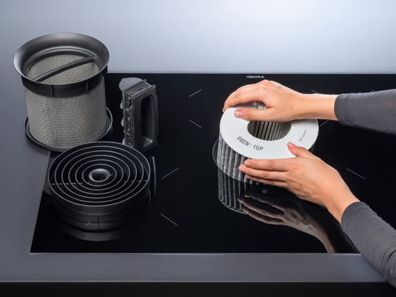 If you use the automatic after-run function, the cooktop extractor fan will continue to run for about 20 minutes after you have finished cooking. This thoroughly dries out the activated charcoal and binds the odour molecules more effectively. If BORA cooktop extractors with a recirculation system are properly installed in a normal indoor climate, there is no risk of condensation or mould growth.