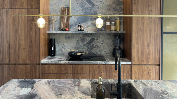 In keeping with the spirit of contemporary design, the basis for the charming island kitchen in Utrecht is a combination of high-quality natural materials, a mix of different textures and a touch of minimalism. The kitchen fronts are furnished with American walnut wood while the worktop is a unique piece made from four-season quartz. Space-efficient and subtle, the kitchen island provides a well-sized work surface, a sink with black taps and a dining table integrated on the side.