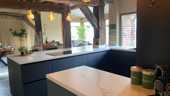 Wood is welcome in the country house kitchen, but it doesn't have to be. Surfaces made of natural stone are very durable and robust. A country house kitchen made of white wood, for example, goes well with a worktop made of grey slate or white marble with an elegant grey-black grain.