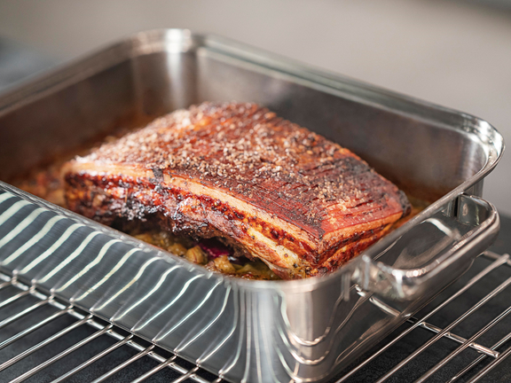 Roasters are specially designed for braising in the oven and can also be used on the hob. They tend to be shallow and are ideal for large pieces of meat. Casseroles have a higher rim and are suitable for stews with a lot of liquid, for example for braising goulash in the oven.