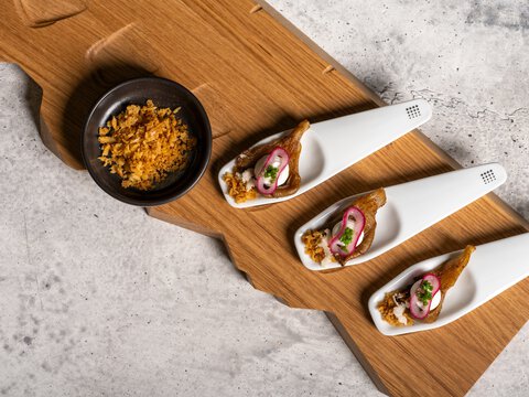 When arranging a mini dish on a spoon the rules are slightly different than when serving food on plates. The proportions of the individual elements must be carefully chosen so that all of the flavours work well together in one bite.