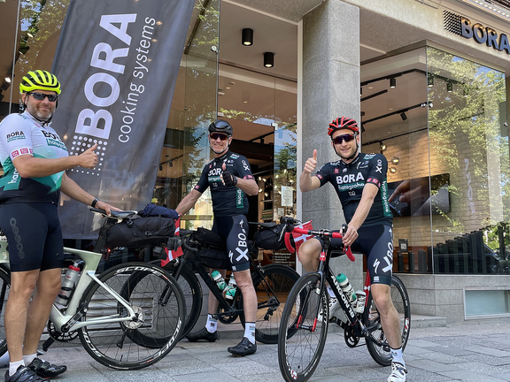 Lars’s trip to Raubling soon attracted attention. Since this was his first cycling adventure without the support of an escort vehicle, news of his plan spread even faster. The hype around his trip to Raubling took Lars by surprise, but he enjoyed it and documented the journey with short video diaries. His boss was so taken with the idea that he decided at the last minute to fly to Munich and accompany Lars and Jan for the last stretch by car. A proper welcome awaited them on arrival at the BORA headquarters, plus top-notch refreshments made by BORA, of course.