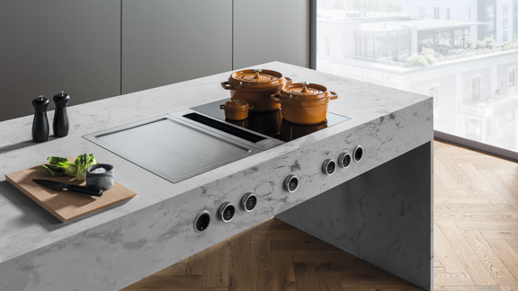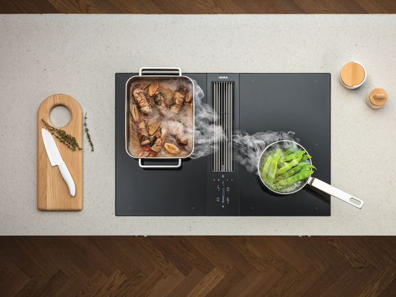 El siguiente sistema compacto, el BORA Pure, da colorido a las cocinas desde 2019, gracias a sus toberas de entrada. Gracias al mando táctil central y la colocación bien estudiada de las zonas de cocción, hay espacio suficiente para hasta cuatro ollas de 24 cm. Un año después, llegó el BORA X Pure con su llamativa tobera de entrada negra y la superficie de inducción total particularmente grande. El miembro más pequeño y reciente de la familia de nuestros sistemas compactos es el BORA S Pure, instalado desde 2021 en muchas cocinas de pequeño tamaño. En sus cuatro zonas de cocción de diferente tamaño y disposición asimétrica caben ollas y sartenes de cualquiera de las medidas habituales.