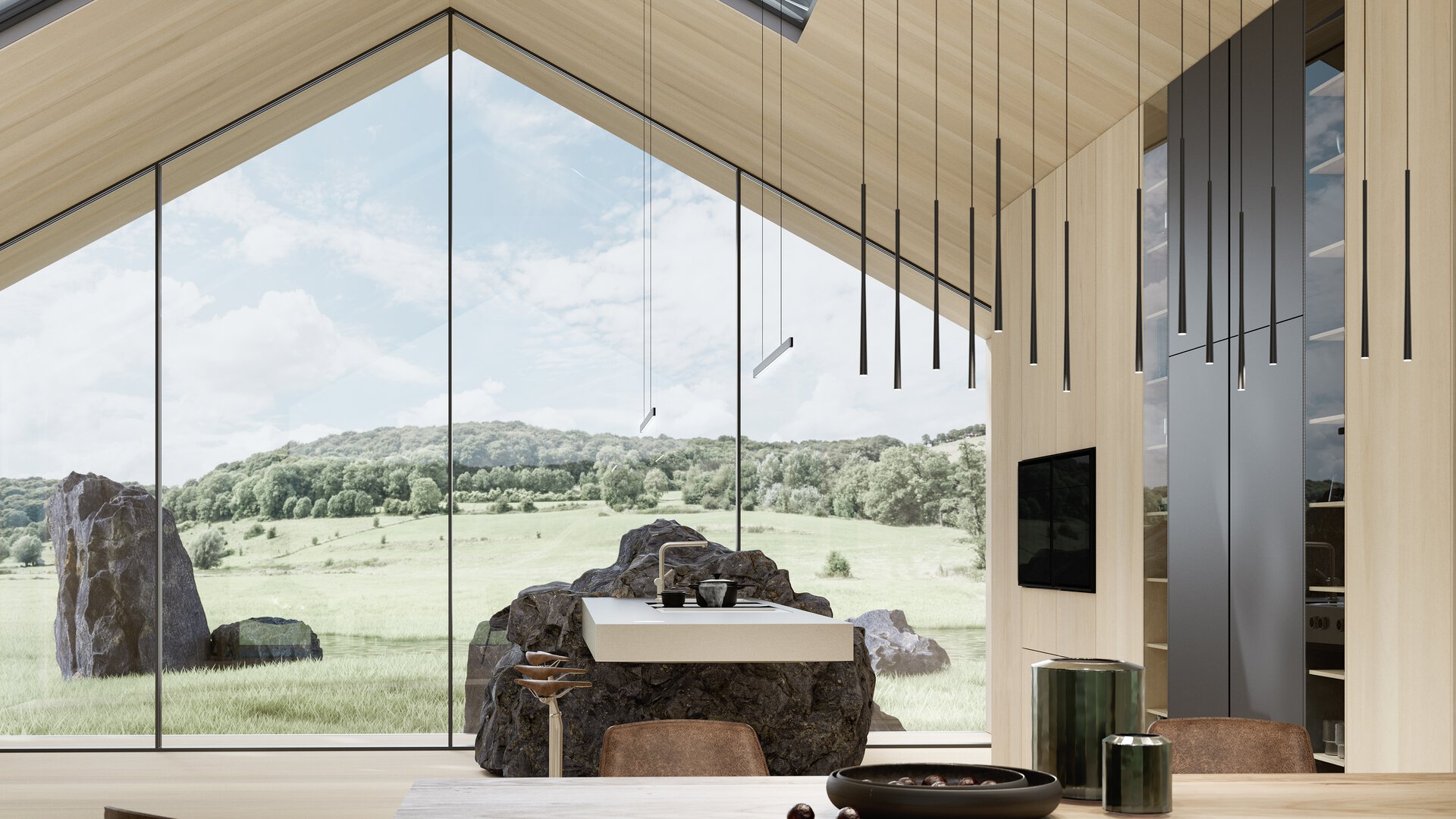 La lámpara colgante lineal BORA Horizon y la lámpara colgante vertical BORA Stars se instalan suspendidas sobre las encimeras, la placa de cocción o la mesa, proporcionando una iluminación óptima y un ambiente agradable gracias a la posibilidad de atenuación en función de la situación lumínica deseada.