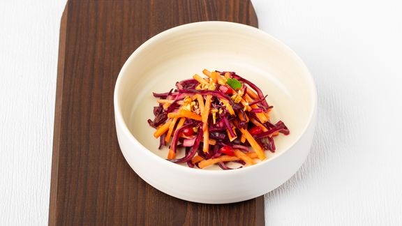 Escurrir la lombarda y agregar a las zanahorias y el resto de los ingredientes del cuenco.