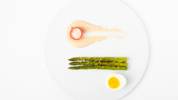 800 g espárragos verdes, 12 pieza rabanitos, 2 cda. aceite de oliva, 1 cda. vinagre balsámico (blanco), 1 pizca sal