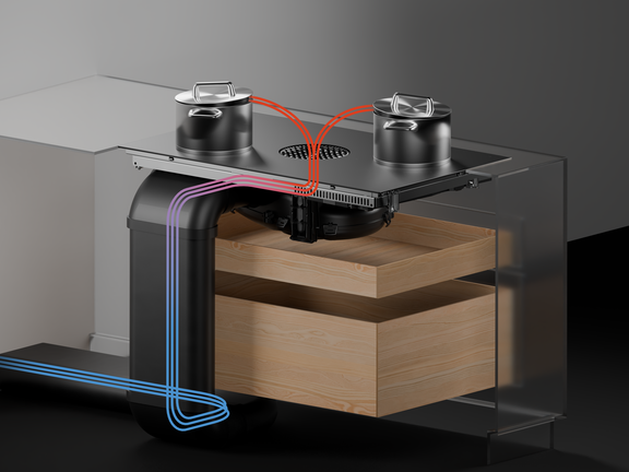 Con una altura inferior a 200 mm, ofrece un espacio máximo para ollas y otros utensilios de cocina en el armario inferior. Sin necesidad de acortar cajones, ni siquiera para el modo de recirculación.