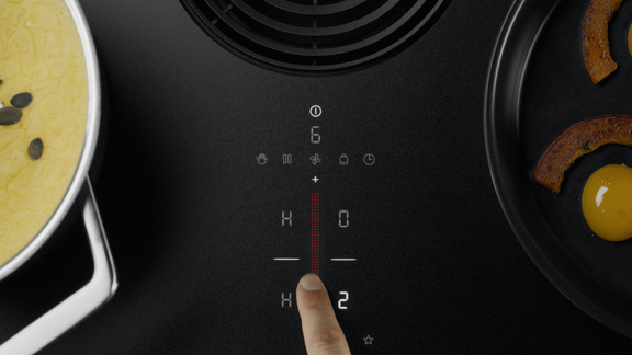 Discretamente integrado en la placa de cocción, reacciona con precisión al contacto y ofrece una orientación clara y sencilla gracias a la visualización en tres colores.