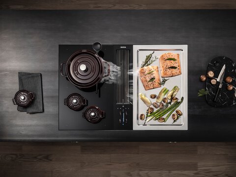 As an added bonus, cooking with the BORA Tepan stainless steel grill means you need hardly any pots and pans and it’s also quick and easy to clean: after use, simply tip a glass of water or ice cubes onto the hot surface and scrape away any residues. The rounded inner corners make it easy to remove even the smallest of flecks.
