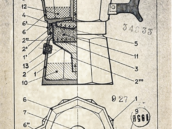Ce principe de base, l'inventeur né en 1888 dans le village de montagne de Montebuglio l'a appliqué à sa cafetière Bialetti. L'eau chauffée sur la cuisinière sort d'un pot octogonal en passant par un tamis contenant du café moulu et s'accumule dans le récipient vissé au-dessus. Le matériau de fabrication de la cafetière espresso est l'aluminium, dont Alfonso Bialetti a appris les techniques de travail lors d'un séjour à Paris. En effet, une autre condition de base pour avoir la chance d'être inventeur est de connaître parfaitement le métier et les matériaux du monde des produits dans lequel on souhaite travailler.