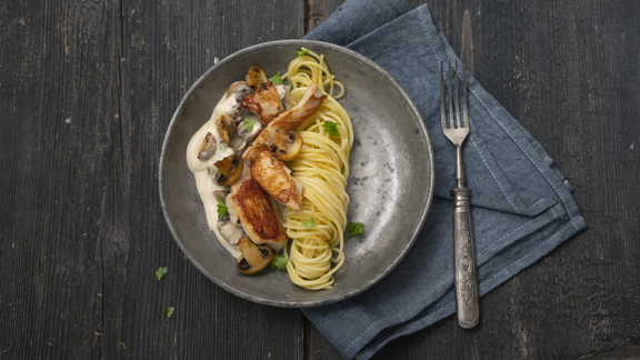 Servir les spaghettis avec les lamelles de poulet grillées, la sauce et le persil haché.