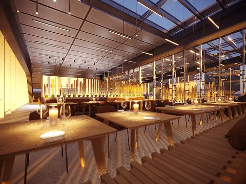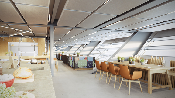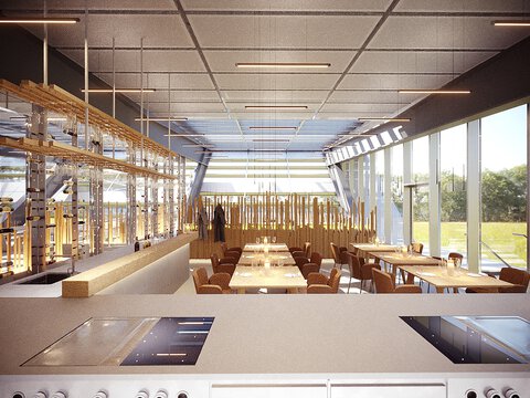 Le principe d’architecture imaginé par LORENZATELIERS a pour ambition de créer une architecture visible et correspond ainsi parfaitement à la philosophie de BORA. L’intérieur révèle notamment les énormes poutres en acier, volontairement laissées apparentes. Avec une mise en scène moderne de l’expérience des produits et du monde de la marque, la BORA Experience se dévoile aux partenaires commerciaux de l’entreprise, ainsi qu’aux personnes intéressées dans les secteurs de la construction, de l’habitat et de l’aménagement, et se manifeste de différentes façons : l’enveloppe filigrane du bâtiment s’étend au-dessus des espaces d’exposition de fabricants de cuisines allemands renommés, de la boutique BORA Flagship Store et, au deuxième étage, du restaurant « Mirror ». Superbement intégré dans la mezzanine, ce dernier est surplombé du plus grand toit escamotable d’Allemagne à ce jour. Un détail unique qui permet de transformer l’intérieur en espace extérieur inondé de lumière : deux grands éléments coulissants de 63 mètres carrés chacun confèrent, par beau temps, une atmosphère unique à la zone du lounge et du restaurant, presque sans aucune nuisance sonore des milliers de véhicules circulant à proximité.