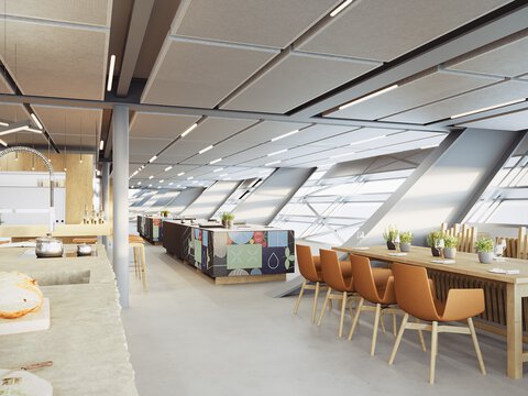 Avec son impressionnante cuisine d’exposition et sa zone de restauration tout aussi vaste, la spacieuse boutique permet de découvrir l’ensemble des produits de la marque lors d’événements Live Cooking. Ici, comme dans les autres zones, un concept audio adapté à cet espace ouvert a été conçu par les spécialistes du son Poet Audio. Une surface d’exposition leur est d’ailleurs dédiée au sein du bâtiment, où les visiteurs pourront découvrir les chefs-d’œuvre de la marque.
