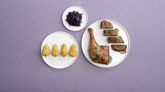 Découper l’oie puis la dresser sur des assiettes avec des croquettes et du chou rouge. Servir la sauce séparément.
