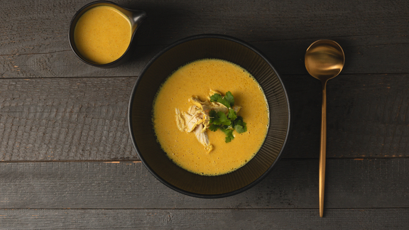 1 c. à s. huile de coco, 2 c. à c. curry en poudre, 400 ml bouillon de poulet
