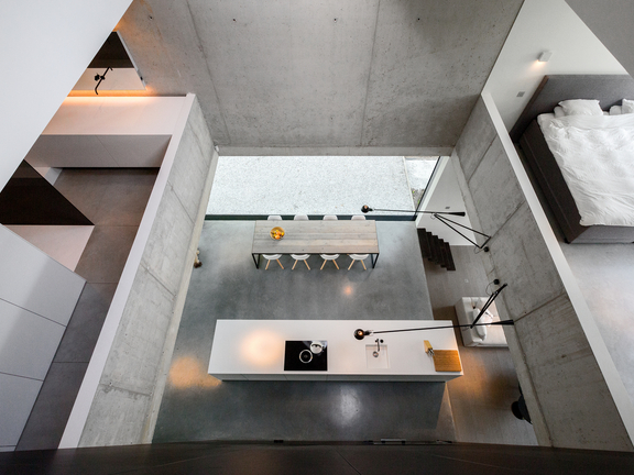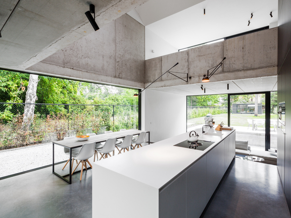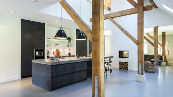 Una planimetria aperta si sposa perfettamente con le cucine "isolane", ad esempio con una cucina in cemento e un piano di lavoro originale in cemento. Un'isola della cucina realizzata con legno di recupero crea un contrasto emozionante. Scaffali metallici aperti, vetrine in acciaio con inserti in vetro e una luce a sospensione in acciaio inossidabile sopra l'isola centrale creano sapienti accenti industriali.