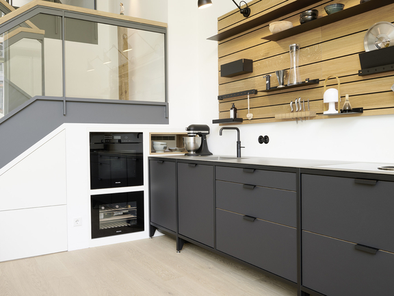 Volete divertirvi in una cucina piccola in stile loft? I design a linea singola sono adatti anche per accenti di tipo loft. Ad esempio, rivestire l'alzatina della cucina con piastrelle in stile metropolitano, optare per una linea dall'aspetto concreto e aprire le mensole a muro in acciaio invece dei pensili chiusi. L'illuminazione industriale sopra il piano di lavoro e gli accessori dall'aspetto vintage, ad esempio in ceramica o gres porcellanato, completano il look complessivo.