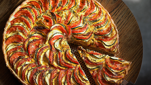 Disporre le zucchine e i pomodori a ventaglio sulla pasta. Versare sopra il composto alle uova e cospargere con l’altra metà delle erbette.