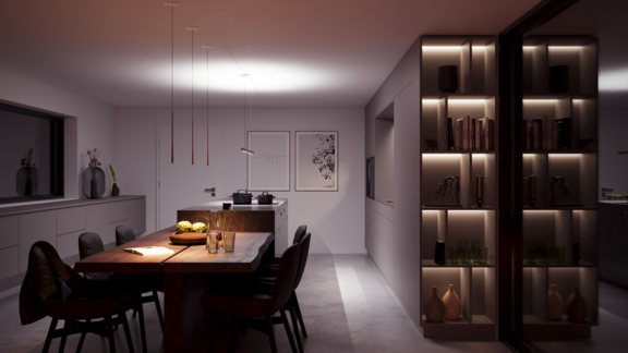 Un altro scenario tipico è quello di una cena atmosferica per due persone. In questo caso, l'apparecchio a sospensione assume il ruolo principale, mentre l'illuminazione ambientale passa in secondo piano. La luminosità dell'illuminazione del tavolo da pranzo può essere regolata a piacere con un dimmer. Questa funzionalità è utile anche per una cena romantica a lume di candela. Senza un'illuminazione supplementare discreta, la luce delle candele appare spesso un po' troppo cupa.