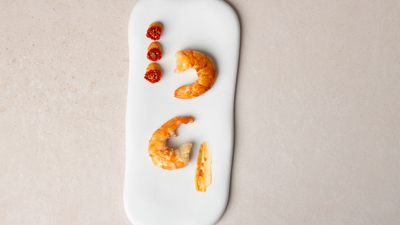 Scaldare l'olio in una padella e distribuirlo uniformemente. Rosolare i gamberi su entrambi i lati per 2 minuti, quindi salare e pepare.