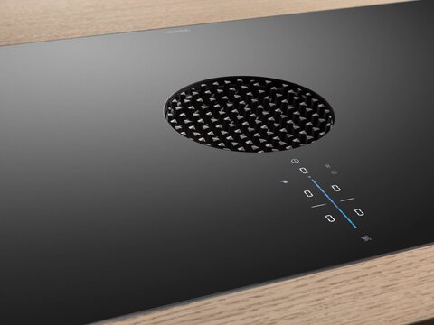 L'aspiratore per piano cottura, i piani cottura e le diverse funzioni sono controllati in modo compatto attraverso un pannello di comando tattile centrale (sControl) con slider touch verticale. Il comando è veloce e intuitivo. Il display della superficie di comando è visualizzato in bianco e blu con contrasti chiaro-scuro ed è praticamente invisibile In modalità stand-by. È riconoscibile soltanto il pulsante onoff che viene retroilluminato dal basso.