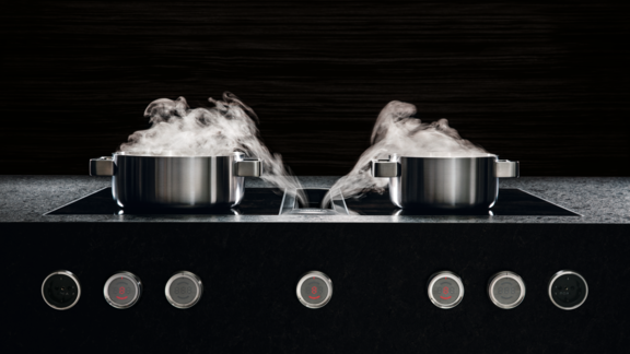 Con BORA i vapori di cottura e gli odori non salgono in alto, ma vengono aspirati nel punto in cui si formano. Dietro si nasconde la fisica applicata secondo i principi base della fluidodinamica: la corrente trasversale è maggiore della velocità di ascensione del vapore di cottura che si forma nelle pentole e nelle padelle. Dal punto di vista puramente fisico è anche più facile aspirare il vapore direttamente sul piano cottura.