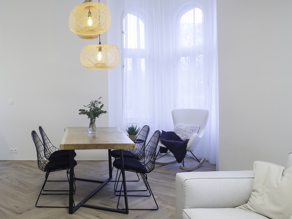 Vous pouvez le personnaliser à votre guise : Si la cuisine-séjour doit avoir un aspect moderne et minimaliste , on peut par exemple envisager une table rectangulaire gris anthracite avec deux bancs sans fioritures, éclairés par la lampe suspendue innovante BORA Horizon. Si vous aimez le confort, utilisez une table en bois rustique avec des fauteuils colorés.